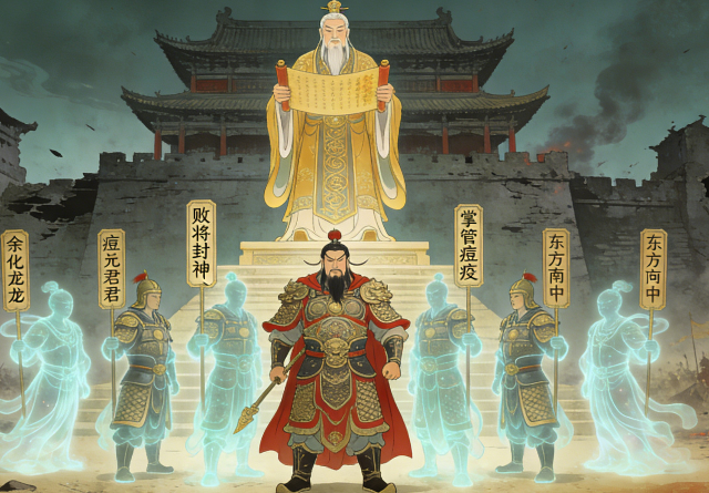 姜子牙气不过,攻破潼关后杀了余化龙的五个儿子,余化龙见儿子们都死了,也拔剑自刎。没想到伐纣成功后,姜子牙竟册封余化龙为主痘元君,五个儿子分别当了东西南北中五方主痘正神——这操作也是没谁了,打不过就封神,从此余氏一家成了掌管痘疫的“官方团队”。