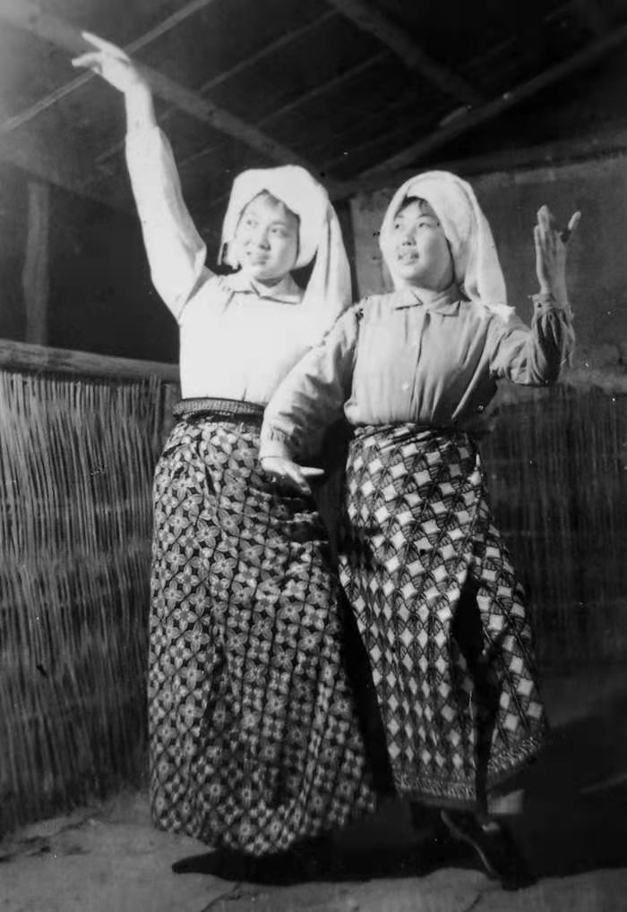 看看我们的藏族演出服,外面这个白色大褂就是我们的工作衣,人人都有的。我们的五彩藏族头饰是用旧绷带染上红药水、紫药水、黄连素水,绿颜料编织而成的。腰上的那个彩条布是用旧床单贴上彩纸制作的。脚上的水靴是我们在老挝必备的,所以,人人都有。到此,一套漂亮的藏族演出服就制作好了,不用花一分钱。